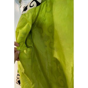 This jacket exudes a vibrant flair with its eye-catching geometric pattern, featuring an intriguing blend of black, green, and white hues. Crafted meticulously from a cotton shell and polyester lining, it promises comfort and durability. The unique loop and hook closure adds a touch of sophistication, making it a suitable choice for those who appreciate distinctive fashion.