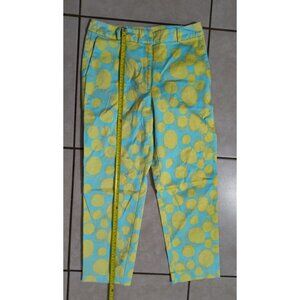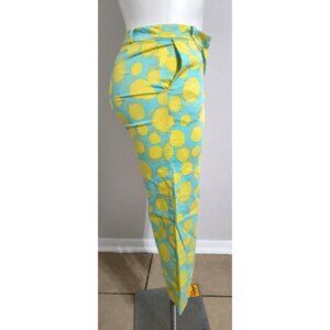 novelty print, Lemon print pants, cropped pants size 8, capri pants, yellow trousers, summer fashion 2025, lemon motif, citrus pattern, coastal grandmother style, Y2K trend, celebrity capris, Hailey Bieber inspired, Anne Hathaway look, resort wear, garden party outfit, vacation essentials, bright yellow capri, summer brunch outfit, lemon slice pants, stretch cotton blend, high rise capri, influencer style, pastel trend, spring wardrobe refresh, weekend getaway, casual chic trousers.