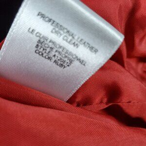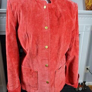Gorgeous soft suede jacket with gold snap closure and stand up collar. Rich warm orange tone. Sleeves can be worn cuffed or uncuffed. Easy to style.