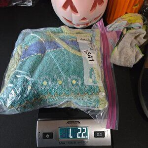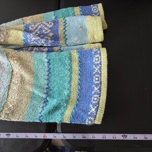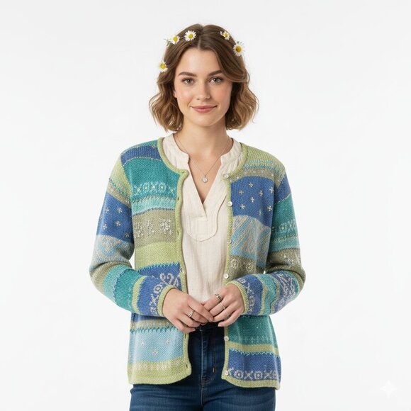 blue green multicolor colorful art artsy casual fall winter spring summer long sleeve sequin embellished button up down front cardigan top shirt blouse bright vibrant knit Cottagecore cottage grandma granny grannycore cabin cabincore Fair Isle Coquette vintage vtg retro 90s y2k Nordic Pattern