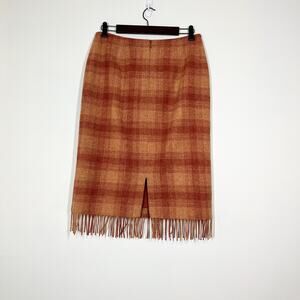David Brooks Wool Blend Plaid Fringed Skirt Sz 10 Light Burnt Orange Lined Slit