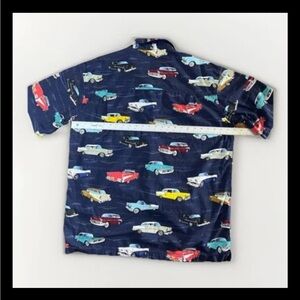 Cruise into retro vibes with this awesome David Carey button-down featuring colorful vintage cars on a navy background.