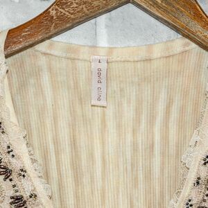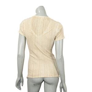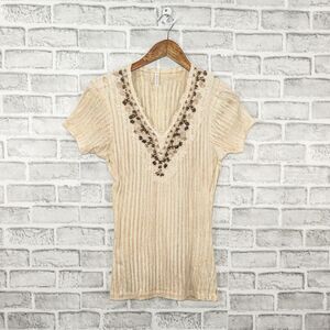 David Cline Women's Embellished Vneck Tee Shirt in Beige Cotton size Large