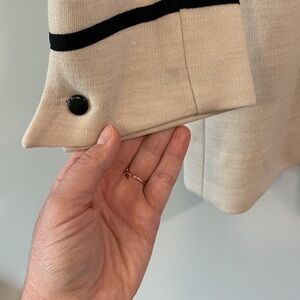 See images for imperfections, in otherwise great condition structurally. Arrow point cuffs, black ribbon details and seriously gorgeous lines.