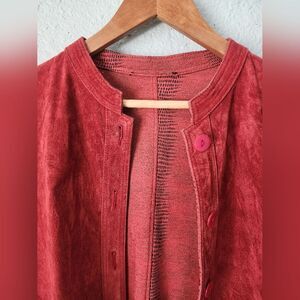 Stylish red suede jacket with button-up front. Perfect for layering.