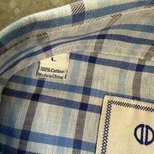 Elevate your wardrobe with this classic David Donahue long sleeve button-up shirt. Crafted from 100% cotton, it features a timeless blue and white plaid pattern with a subtle herringbone weave for added texture. The embroidered DD logo in navy adds a signature designer touch. Perfect for work, casual outings, or layering under a blazer for a polished look.