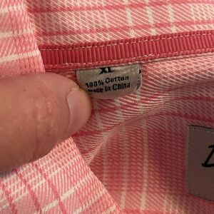 Pink and white tartan plaid button down dress shirt. Made of 100% cottton, machine washable.