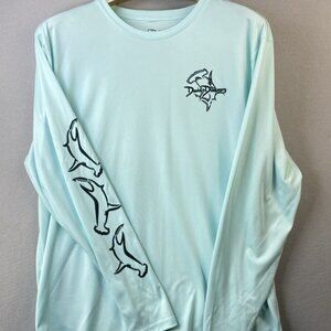 This is a David DunLeavy Performance T-shirt in size XL with a Hammerhead Shark design in Artic Blue. Made of Polyester microfiber, it features a Shark and Fisherman theme with a logo accent. The shirt is short-sleeved with a crew neck and is machine washable. It is double-sided with a graphic print, suitable for all seasons. This T-shirt is part of the Men's Clothing collection and is not vintage.