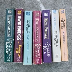 Here’s a lot of 7 books by David Eddings. All are vintage and do show wear as shown due to age and use. Fully intact and perfect for any Fantasy fan reader! Nice selection of stories! :)