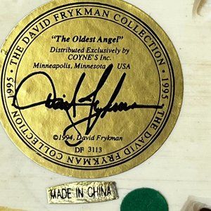 Whimsical and oh-so-sweet David Frykman Collection "The Oldest Angel" vintage figurine from 1994. The angel is playing an accordion and has a halo that can be moved from side to side. This decor piece is sure to make you smile and would be great to display for Christmas or all year long.