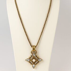 David Grau Signed Gold-Tone Necklace with Pearl & Crystal Pendant 42”