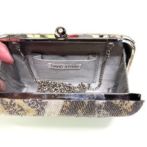 Simply stunning for your special occasion! This beautiful hard sided hand made clutch is covered with gold, pewter and silver beads creating a stunning tone-on-tone textural effect. The bag has a ball snap closure with a gold chain strap. Beading is identical on both sides. Gold tone metal.