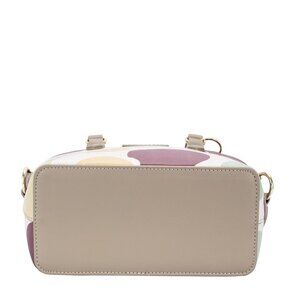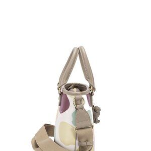 This stylish polka dot handbag features a vibrant multi-colored circular pattern on a clean white background, crafted with premium materials including leather trim handles and gold-tone metal hardware. The structured tote design offers both fashion and functionality with its spacious interior and dual carrying handles. Perfect for modern women who appreciate contemporary geometric prints and versatile accessories that transition seamlessly from casual to professional settings. The decorative charm detail adds a playful touch while maintaining sophisticated appeal.