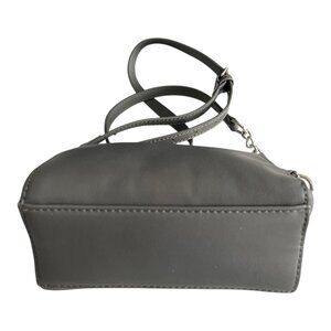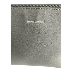Chic and modern gray crossbody bag by David Jones Paris, crafted from smooth faux leather with silver-tone chain and strap details. The structured shape and compact size make it perfect for carrying essentials in style. Inside features a zip pocket and open slip compartments with logo lining for organized storage.