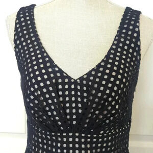 David Lawrence Circle Black Textured Dress. Black dress with peepholes design over nude color lining. Gathered bust to waistband. Fun dress for a night out or special occasion. Side zipper entry