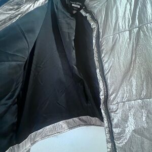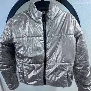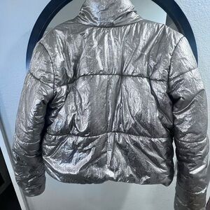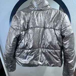 Beautiful Chic bomber puffer jacket FEATURES • Fits true to size, order your normal size • Model measurements: 5'10" height, 33.5" bust, 23.5" waist, 34.5" hips, wearing a size small • Stand collar • Long sleeves • Front zip closure • Side slit pockets • Cropped silhouette • Metallic finish • Lined • Imported MATERIALS & CARE • 100% nylon; lining & fill: 100% polyester • Machine wash