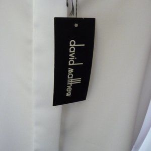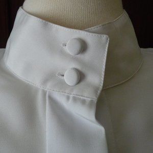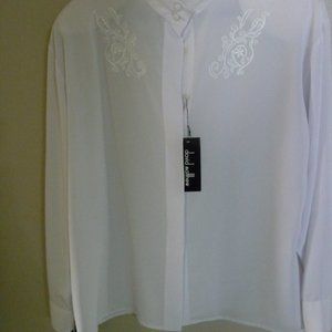 Unworn, with tags, mandarin collar blouse. Embroidery on chest, soft shoulder pads, covered buttons at placket and cuffs. Purchased 1990's. Size 16. Specifics, shoulder 20ins, bust 42ins, length 26ins, sleeves 22ins. Polyester, made in Korea. Machine wash (delicate).