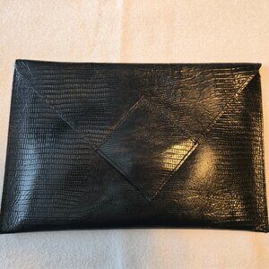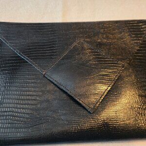 David Mehler For Dame Black Clutch. David Mehler For Dame 7”x11” Black Clutch, Used But In Good Condition. GUC. Black Clutch and Gorgeous Triangle on top of the snap closure. Decorative. Leather. One zipper pocket inside. No rips, stains or odors. Alligator snake styled skin. Used and Light wear marks as shown. Very LIGHT white mark on the back as shown.