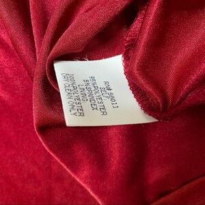 Crossover V neck, stretchy, fully lined. A line skirt, 3/4 sleeeves. Crimson red