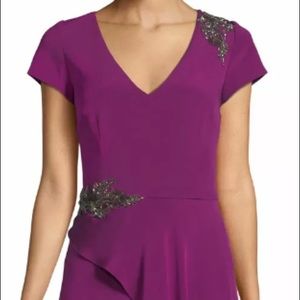 Gorgeous David Meister gown with beaded embellishments. V neckline. Short sleeves; left beaded shoulder. Right beaded detail at waist. A-line silhouette. Hidden back zip. Asymmetric slit skirt. Draped ruffle trim. High-low hem. Polyester/spandex. Imported.