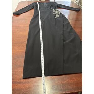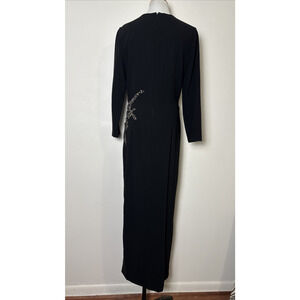 Style: black evening gown, long sleeve dress, V-neck dress, wrap style dress, formal gown, floor length dress, cocktail dress, elegant black dress, beaded embellishment dress, special occasion dress, classic black gown, sophisticated dress, minimalist dress, timeless formalwear, holiday, mother of the bride or groom