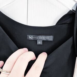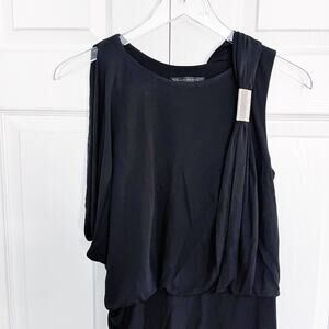 One open shoulder, batwing sleeve. Silver-tone metal detail. Side ruching. Lined.