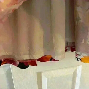 Beautiful David Meister fit & flare midi length dress, women's size 2. Colorful with black accents, floral design. Zip closure on the back, cap sleeve. Bow accent across the waist. The bottom of the dress is pleated and each section is sewn. Fully lined. There is no tag with the fabric detail, however the fabric of this dress is very heavy.
