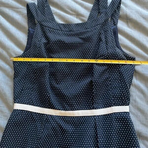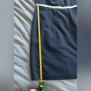 This is a perfect, well made dress. In pristine pre-owned condition. No rips, stains, or tears. Textured polka dot pattern. Ribbon detail. The skirt of the dress is 24 inches long. Waist is 30 inches. Pit to pit measures 17 inches. (Please see pics for measurements). Pet and Smoke-free home.