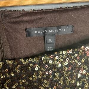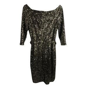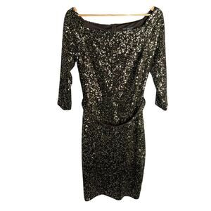 David Meister Sequin Dress in Gold. Size 10. Features boat collar, 3/4 sleeves, belted, sequin throughout, hidden back zipper closure, sheath silhouette, and mini length. Style ZQUJ9711. Self: 100% Nylon. Lining: 100% Polyester. Excellent condition, no flaws.