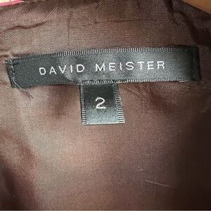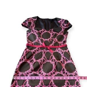 Women’s size 2 pencil sheath dress by David Meister. Chocolate brown and pink geometric retro design, cotton and spandex blend.