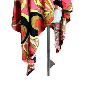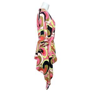David Meister pink and green retro print drama tunic size M. Missing the tie belt. Keyhole back. Flutter sleeves. Asymmetric hemline. Loose fit. 100% polyester. Length 29” front and back 48” sides.