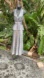 this is a stretch, silver lame fabric with blue undertones. The top looks like a halter however it has a full insect back. The waist has a rhinestone floral jewel like element. Then there is a little pepper in a straight pencil style skirt. There’s plenty of stretch to this. Please note dress has been cut and shortened from original check length otherwise in excellent condition.