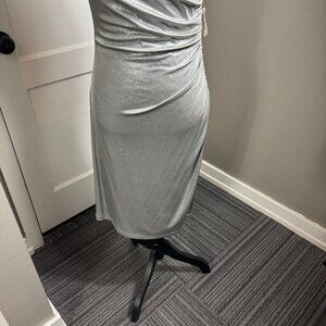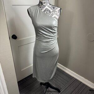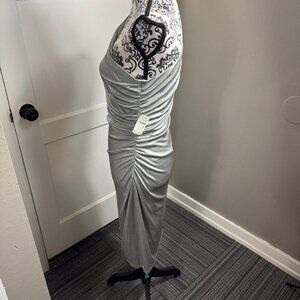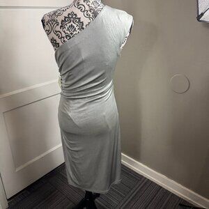 David Meister silver shimmer one shoulder knee length ruched cocktail dress