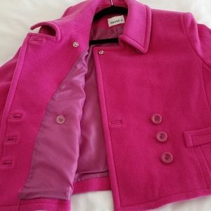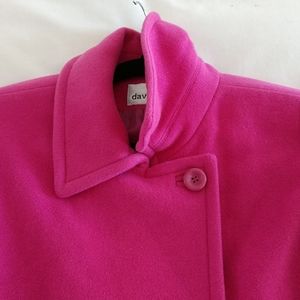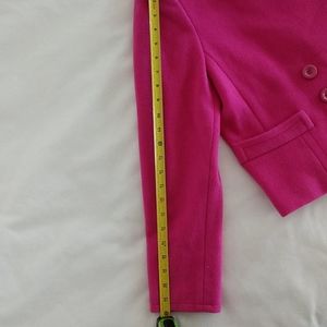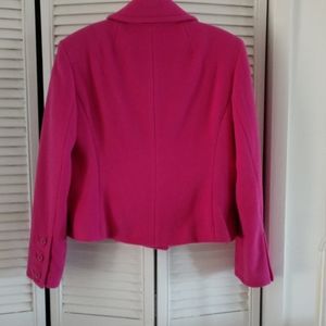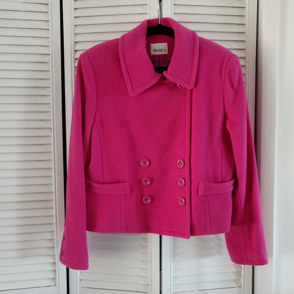 Hot pink jacket. Six button double breasted, three button acsent on cuffs, one button closure at neck. No material tag, appears to be wool outer with polyester lining. No size tag, but seems to be M/L so please check measurements: Length: approx. 22", Width: 19" flat, Sleeves: 24". Slight padding in shoulders to give definition. Lovely jacket in very good condition.