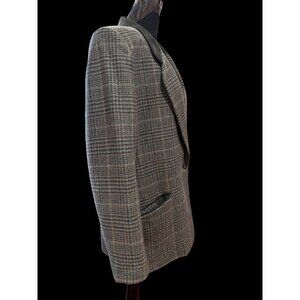 This classic blazer features a timeless glen plaid pattern with a luxurious velvet collar accent. Offers durability and insulation. Its structured design and single-button closure add sophistication, making it a versatile piece for layering.