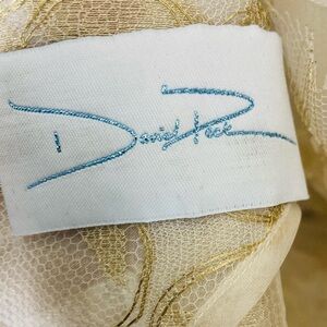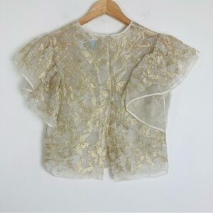 David Peck pale gold lace cropped flutter sleeve top. Silk and cotton blend. Fully lined in silk. Beautiful for a holiday party or bridal event with wide leg cream trousers. Size XS
