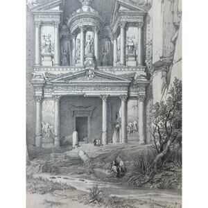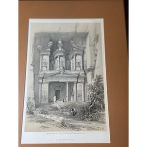 David Roberts’ lithographs are highly regarded for their intricate detail and historical significance. This piece beautifully depicts the iconic Treasury at Petra, Jordan—a masterpiece of ancient Nabatean architecture.