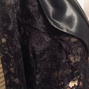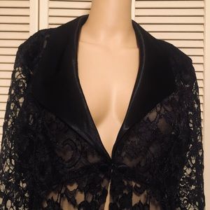 David Rose long sleeve black jacket. A very versatile piece. Lovely lace pattern!!! No size noted but fits medium, pit to pit approximately 18 inches and sleeve 24 inches (measured from shoulder to wrist).