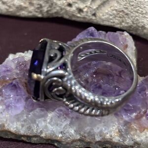 HUGE deeply saturated cushion cut amethyst stone. Great detail in the cut out head of the ring and rolled robe pattern on the split shank. Size 7. Stamped 18k 925 ID DS