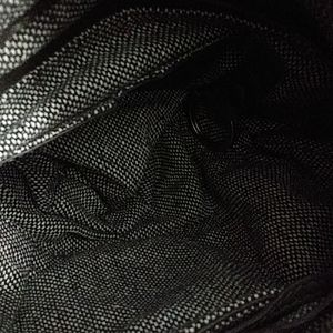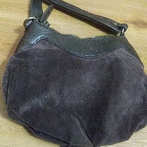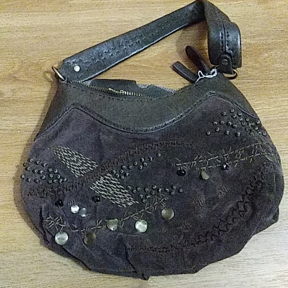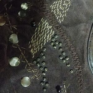 Brown calf leather Velveteen fabric with beads + metal applique and embroidery beautiful interior. Flaw: zipper sticks. Paid $139