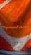 Striking scarf with orange circles on white. Features 'JOY' text. Designed by Marc Jacobs.