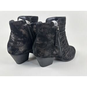 The David Tate Bellview Women's Suede Low heel Boot Booties in size 7.5 wide width are a stylish and comfortable choice for any party occasion. These ankle boots feature a zipper closure, a medium heel height, and a wide calf width for a comfortable fit. Made of black leather with a suede upper, these David Tate boots are a versatile addition to any woman's shoe collection.