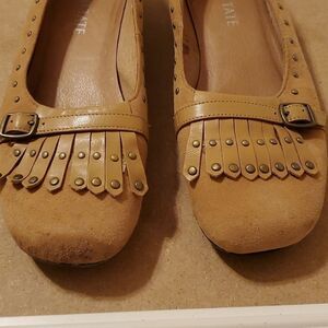 David Tate Jam tan suede flats, loafers, studded accents, size 9. PLEASE note pic of dime size discolored area on right toe. Good overall condition, smoke free home, ships next day. Bundle & Save!