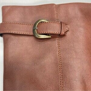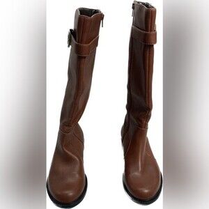 knee high boots, brown, chestnut, solid, faux leather, smooth, zip closure, side buckle, flat heel, riding style, equestrian inspired, casual, everyday wear, fall fashion, winter wardrobe, timeless, versatile, chic, classic, stylish, trendy