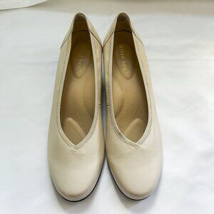 David Tate Women's Madera Bone Lamb Block Heel Shoes. Size- 11 N. The shoes have premium leather uppers with a round toe. Elasticized topline for an easy slip-on style. Soft fabric linings. Leather-lined, cushioned footbed offers added padding at forefoot, heel, and arch for support. Block heel measures approximately 1.5”. Durable rubber outsole. Item will be shipped in a recycled box. Color may vary by screen. Lightly used, good condition. There are a couple tiny scuff marks on the back of one of the shoes. See all photos for details.