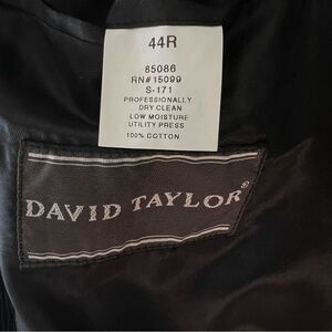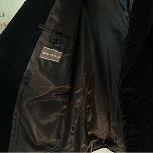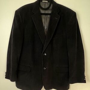 David Taylor Corduroy Blazer. Sport Coat. Men’s. Fully lined. Two Button Front. Size 44R. Black. 100% cotton. Length from shoulder to bottom is 31.5. Sleeve length is 25”. Shoulder to shoulder across the back is 20.5”.
