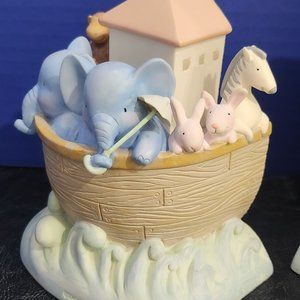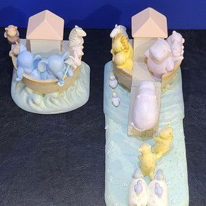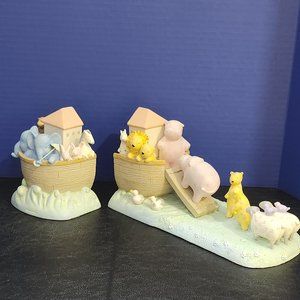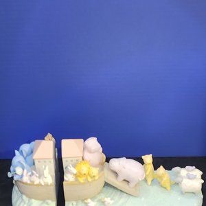 Michael and company vintage pair of Noah Ark bookends. Done beautifully with sweet pastel tone animals. There are two hippos, sheep, elephants, bunnies, zebras, lions, ducks, pigs and spotted cheetahs. Very cute. Love the blue elephant with the umbrella. This vintage piece is in great pre-owned vintage condition. I found no breakage cracks chips discoloration Etc. Very minor wear on the felted bottoms. See photos. These bookends are solid weight and will hold books very nicely on a shelf. Super cute in a child's nursery. Dimension: Small bookend in 5 3/8 inches high 3 5/8 inches deep. 4 5/8 inches wide. Larger bookend is 5 3/8" high x 10" deep x 4 5/8" wide. Non smoking pet free home. @ ER NW Boxed