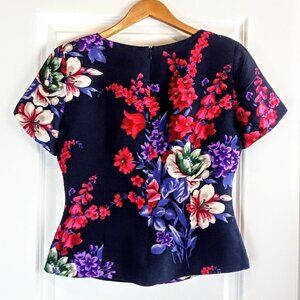 Fully-lined short sleeve pure silk top with wrap effect from David Warren in navy blue and floral print.