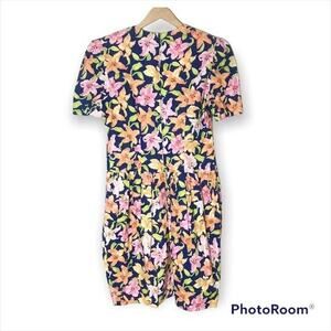 This STUNNING dress will make jaws drop! It is navy blue with a colorful orange, pink, and green tropical print in 100% cotton. It is unlined, and has a zip closure in back. Also has a hook & eye closure but is missing the hook. Features shoulder pads on each side and a square neckline for a 1980s look. Besides the missing hook, this dress is in EUC with no stains or holes. See pictures for details and measurements. Since this is vintage, please check to be sure your body measurements will work, as this dress size may not reflect current sizing standards. Size on tag is women's 16, but does look smaller, and looks to be a knee length
