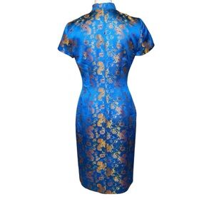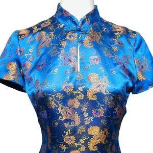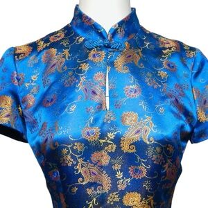 David Warren Vintage 90s Cheongsam Asian Dress Size 8 M Blue Gold Red Floral